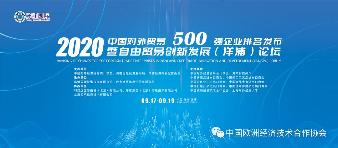 2020年9月18日,由中国对外经济贸易统计学会、海南国际经济发展局和洋浦经济开发区管委会主办,中国欧洲经济技术合作协会支持的“2020年中国对外贸易500强企业排名发布暨自由贸易创新发展(洋浦)论坛”在海南省洋浦经济开发区成功举办。
