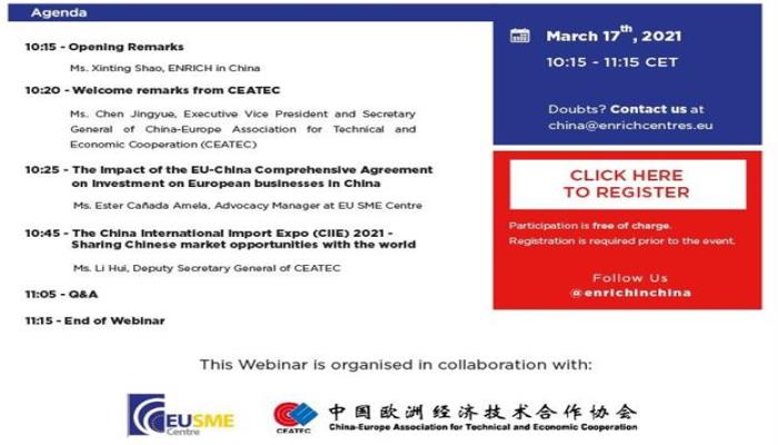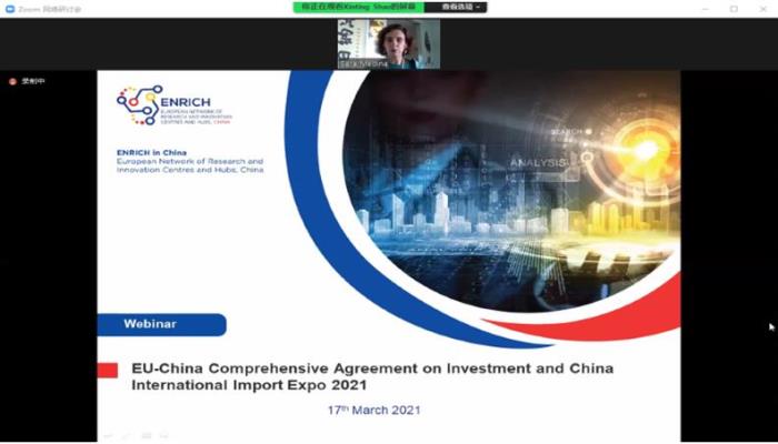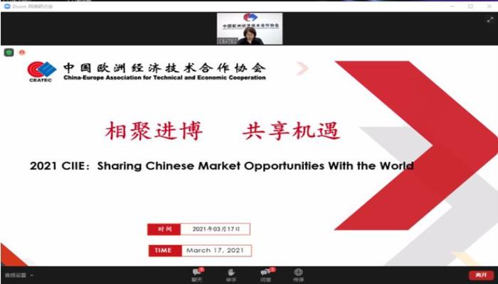 2021年3月17日下午,由中国欧洲经济技术合作协会、欧盟研究与创新中心及欧盟中小企业中心联合主办的“《中欧全面投资协定 》及2021年中国国际进口博览会线上研讨会”成功召开。我会常务副会长兼秘书长陈璟玥女士及副秘书长李惠女士共同出席了本次会议。会议就新形势下中欧双边经贸关系、《中欧全面投资协定》对在华欧洲企业的影响及2021年第四届中国国际进口博览会等热门话题展开了热烈讨论。来自欧洲各国五十多家企业和机构代表通过网络平台参加了此次会议。