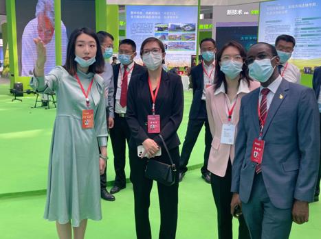▲中欧协会常务副会长兼秘书长陈璟玥(左二)与津巴布韦公使衔参赞Mark Kachinga(马克﹒卡青戈)(右一)参观中博会展区。