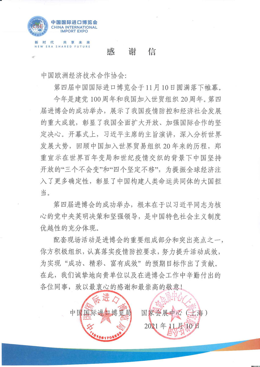 第四届中国国际进口博览会于11月10日圆满落下帷幕,实现了“安全、精彩、富有成效”的目标,我会作为进博会合作伙伴,为助力进博会成功举办做出了应有贡献,并得到了商务部中国国际进口博览局的高度认可。