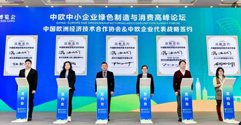 为进一步加深中国欧洲经济技术合作协会与在鄂企业在提升传统消费升级、推进绿色消费规模持续增长等领域的交流与合作,中国欧洲经济技术合作协会与中欧班列(武汉)的运营商——武汉汉鸥国际物流有限公司、注重发展民生消费和绿色环保工程建设的武汉森莱德实业有限公司、武汉大汉口食品有限公司、中鄂飞鹿科技有限责任公司等10家湖北高新技术企业进行战略合作签约。