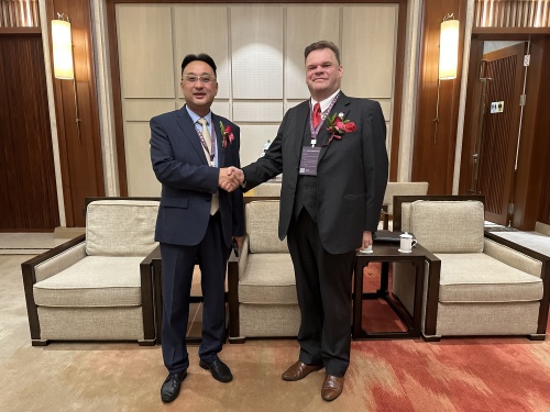 中国欧洲经济技术合作协会副会长代军杨与比利时驻广州总领事馆总领事裴伟岷在会议中进行了亲切交流,双方就当前的中欧经济形势、市场机遇以及潜在的合作领域进行了深入沟通和探讨。