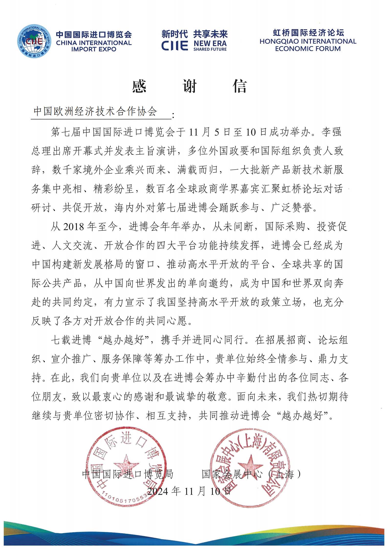 第七届中国国际进口博览会于11月5日至10日成功举办。李强总理出席开幕式并发表主旨演讲,多位外国政要和国际组织负责人致辞,数千家境外企业乘兴而来、满载而归。我会作为进博会合作伙伴,为助力进博会成功举办做出了应有贡献,并得到了商务部中国国际进口博览局的高度认可。
