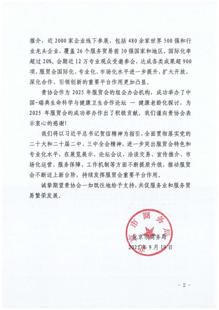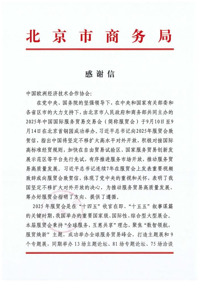 北京市商务局对中国欧洲经济技术合作协会参与2025年中国国际服务贸易交易会等多项活动、为2025服贸会的成功举办做出的积极贡献予以高度认可,特发来感谢信并希望中欧协会能一如既往地支持、合作,共促服务业和服务贸易繁荣发展。