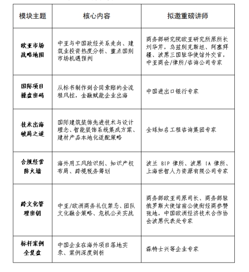 为助力企业突破发展瓶颈,中国建筑装饰协会联合中国欧洲经济技术合作协会,倾行业顶级资源打造“出海战略攻坚研修班+国际市场项目对接会”,以前所未有的“系统性知识赋能+官方项目直通+实战经验复制”模式,助企业抢占欧亚市场先机。