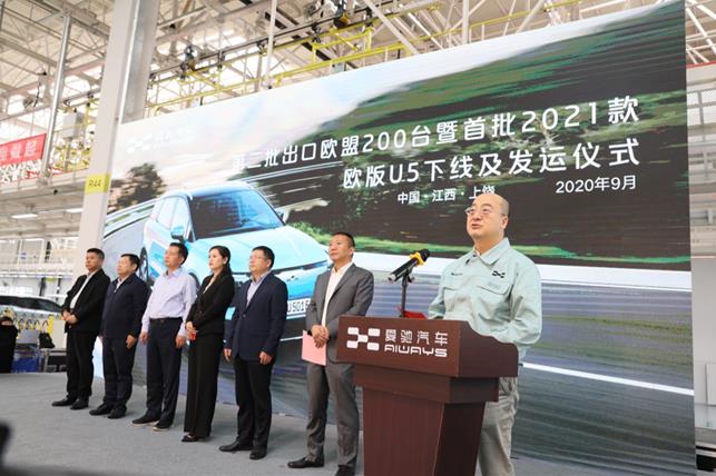 9月23日,爱驰汽车第二批出口欧盟200台暨首批2021款欧版U5从江西上饶的爱驰超级智慧工厂下线,准备发运欧盟。在下线仪式上,上饶市委书记马承祖,上饶市人大常委会副主任、市委秘书长杨建林,上饶市政府副市长刘斌,中国欧洲经济技术合作协会常务副会长兼秘书长陈璟玥,上饶市经开区党工委书记叶和彬,上饶经开区管委会主任邵小亭,爱驰汽车联合创始人、董事长付强,共同见证了这一代表中国智能电动车产业里程碑的时刻。